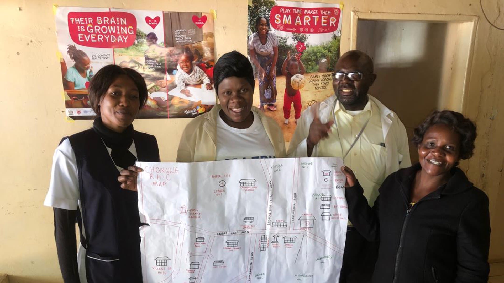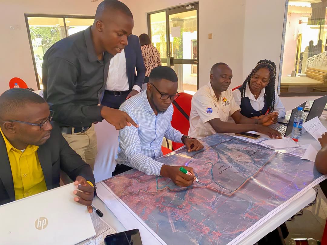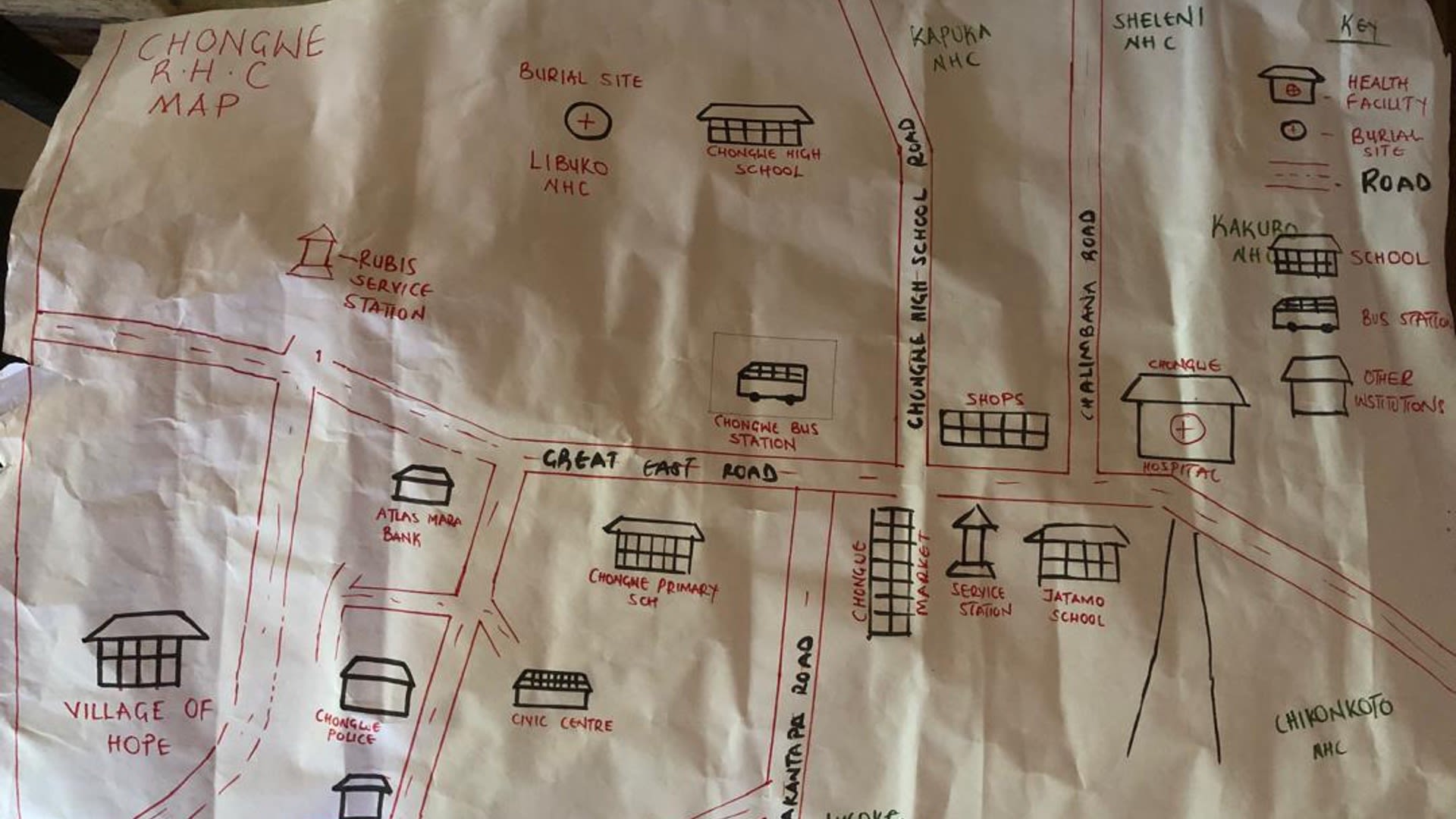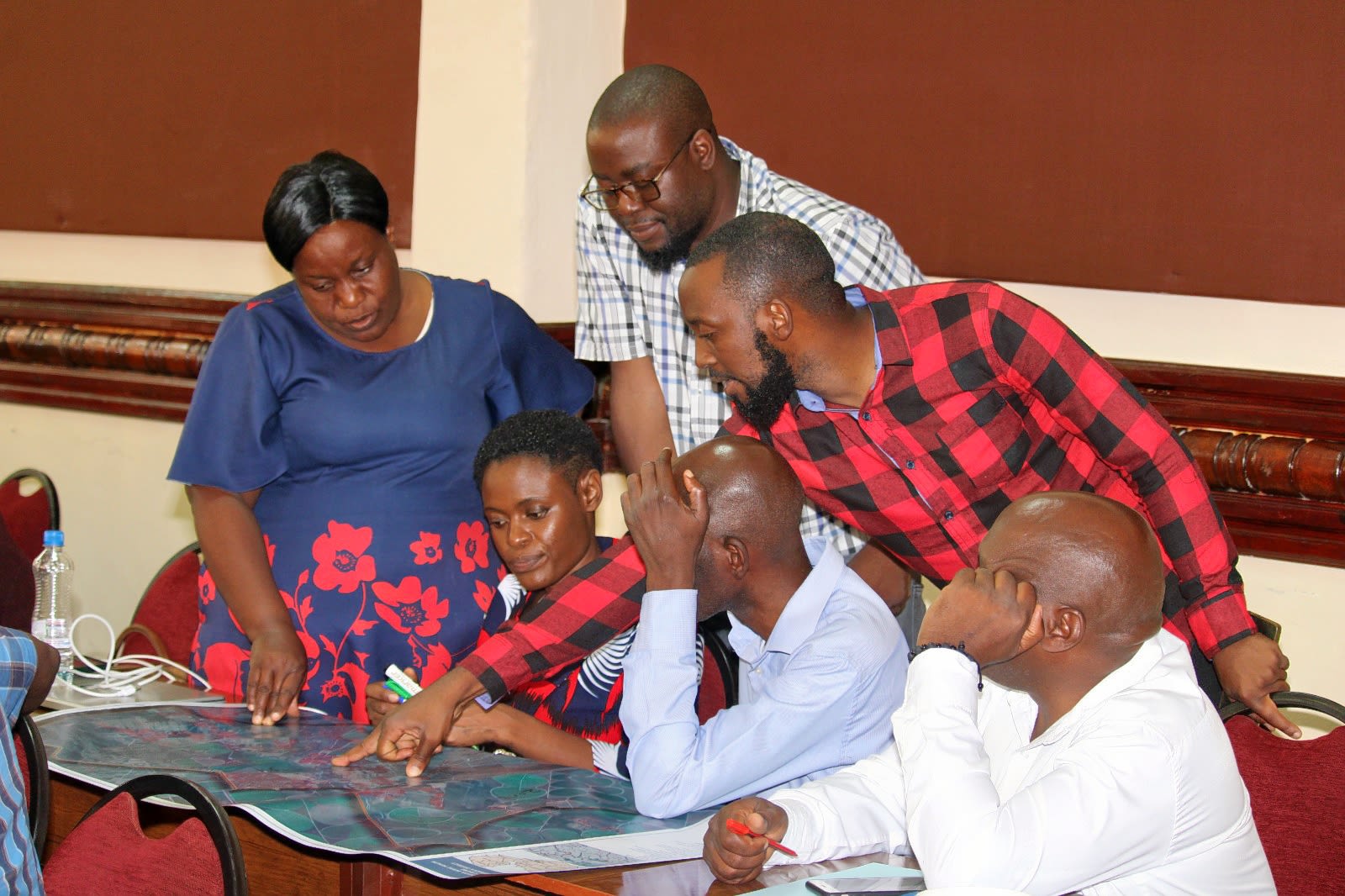Staff from Mazabuka District Health Office point to where a vaccination site should be placed based on knowledge gained through viewing the maps.